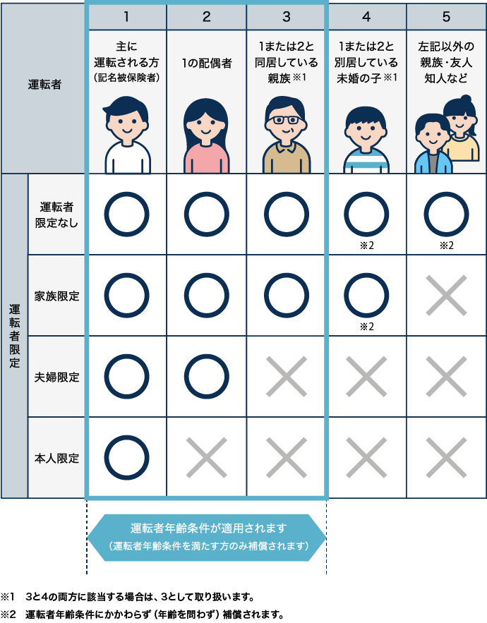 - 運転者年齢条件を設定した場合は、1~3(3と4の両方に該当する場合は、3として取り扱います)については、運転者年齢条件を満たす方が運転中の事故に限り補償します。