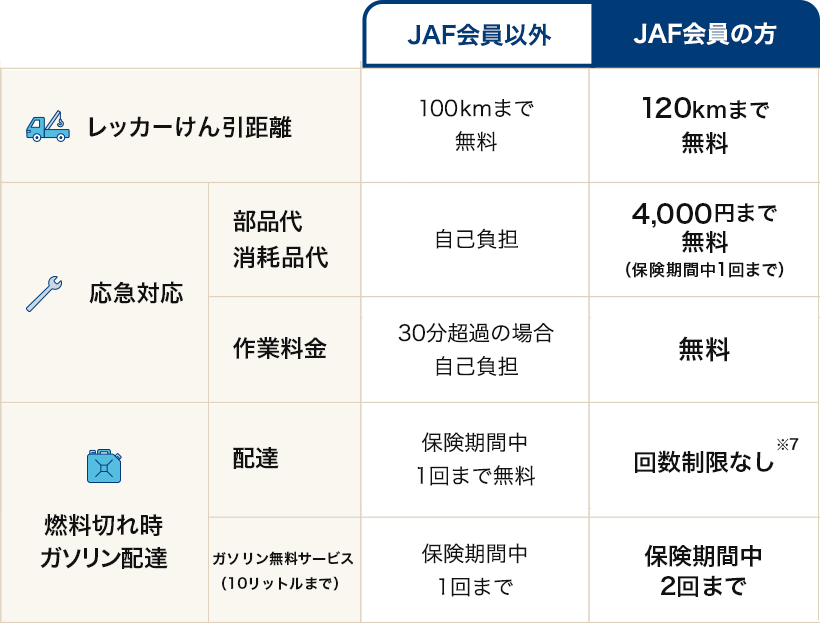 - 交通事情や気象状況、お車の状況などにより、ロードサービスの提供ができない場合があります。また、提携会社の到着にお時間を要する場合や事前のご案内と異なる場合があります。