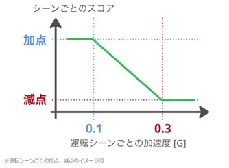 運転スコアは、運転シーンを加速と減速に分類し、ふんわりとした加減速の場合は加点、急な加減速の場合には減点することで算出していますが、加点の割合は加速度によって異なるため、ふんわり判定のみであっても、運転スコアが100点になるとはかぎりません。